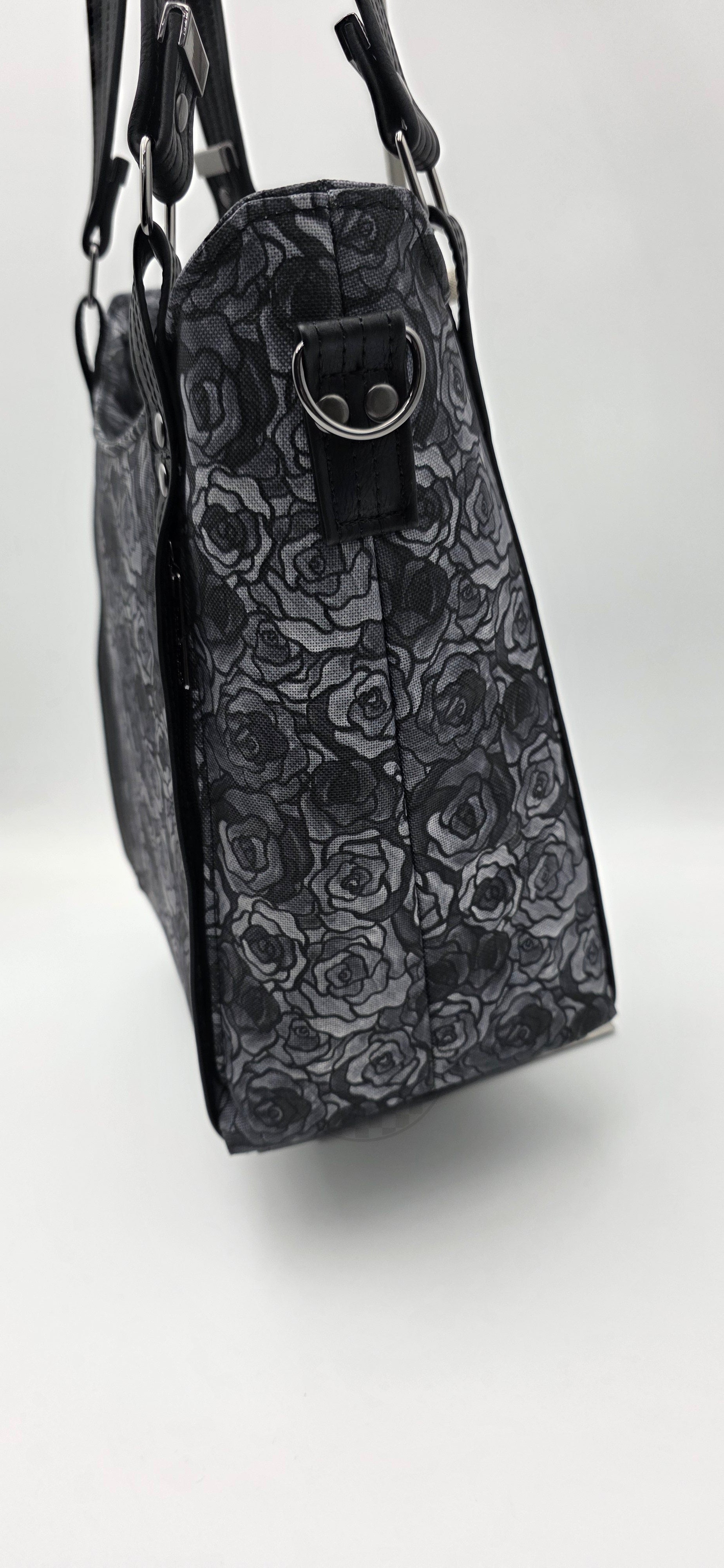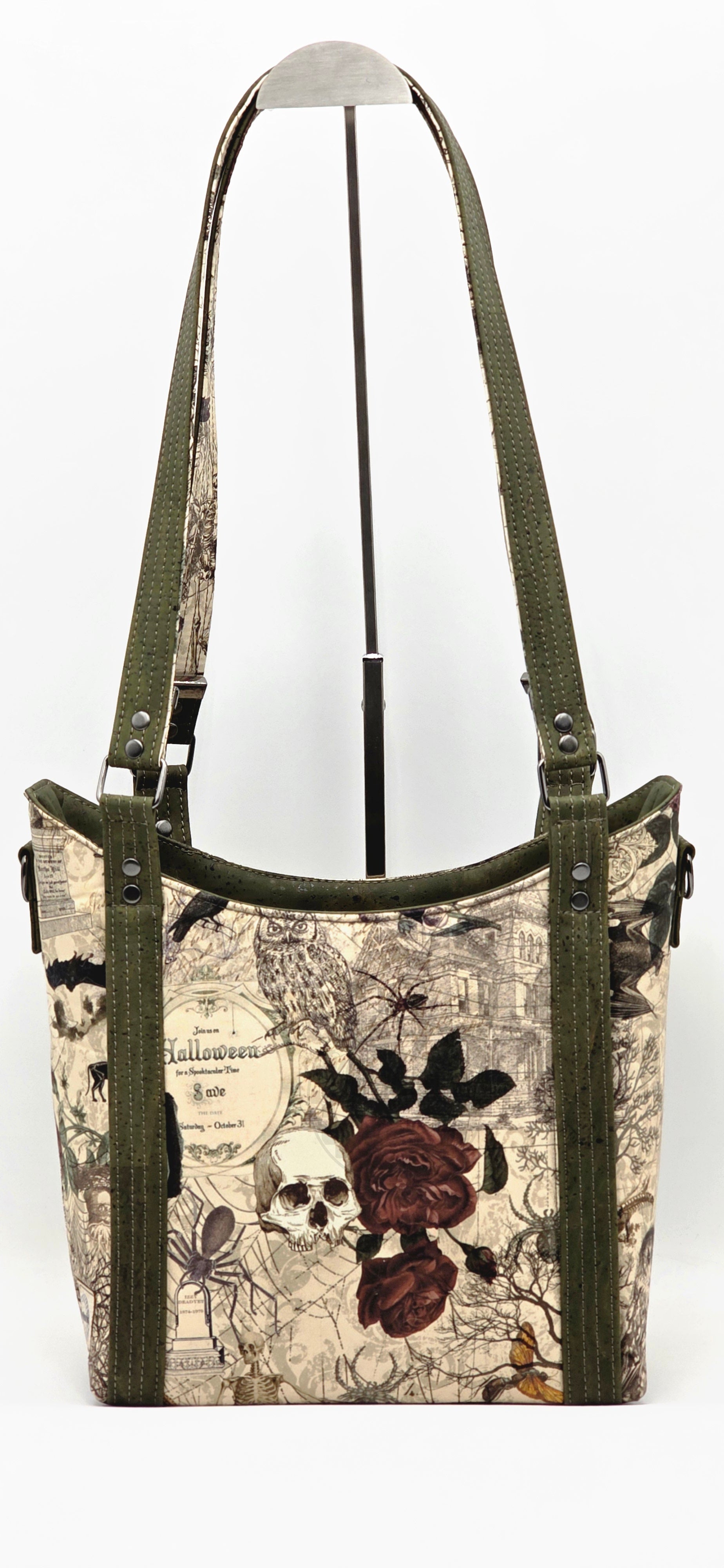 This is a concealed carry shoulder and crossbody bag with a double-sided pocket that is hidden behind the straps for the left- or right-handed carrier. There is double loop Velcro inside the CC pocket. Materials used are waterproof canvas, faux leather, and cotton depending on the design.